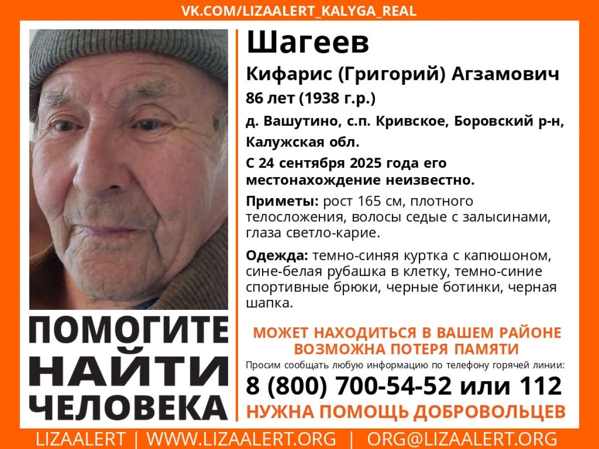 В Боровском районе Калужской области пропал человек. В ночь на 25 сентября был объявлен в розыск 86-летний житель деревни Вашутино. У этого мужчины два имени, одно из них - очень редкое. Пропавшего зовут Григорий, второе его имя - Кифарис. Пенсионер Шагеев пропал 24 сентября, и с тех пор о нем ничего не известно. Калужский отряд "ЛизаАлерт" объявил поиск.