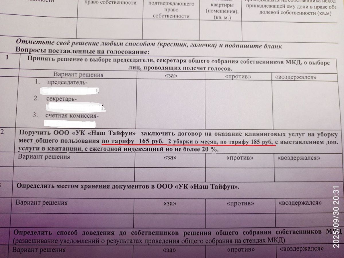 Кроме этого, жительница сообщила о несоответствиях в тарифах на уборку. В анкетах, которые были розданы жильцам, сначала указана сумма в 165 рублей, а затем та же строчка фиксирует 185 рублей.