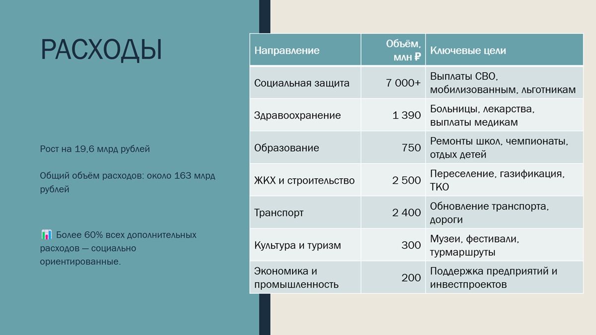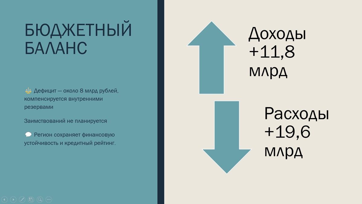 Расходы областного бюджета вырастут на 19,59 млрд рублей. Средства направляются прежде всего на социальные нужды, модернизацию инфраструктуры и поддержку муниципалитетов. Общий объем расходов в 2025 году составит 116,91 миллиарда рублей.