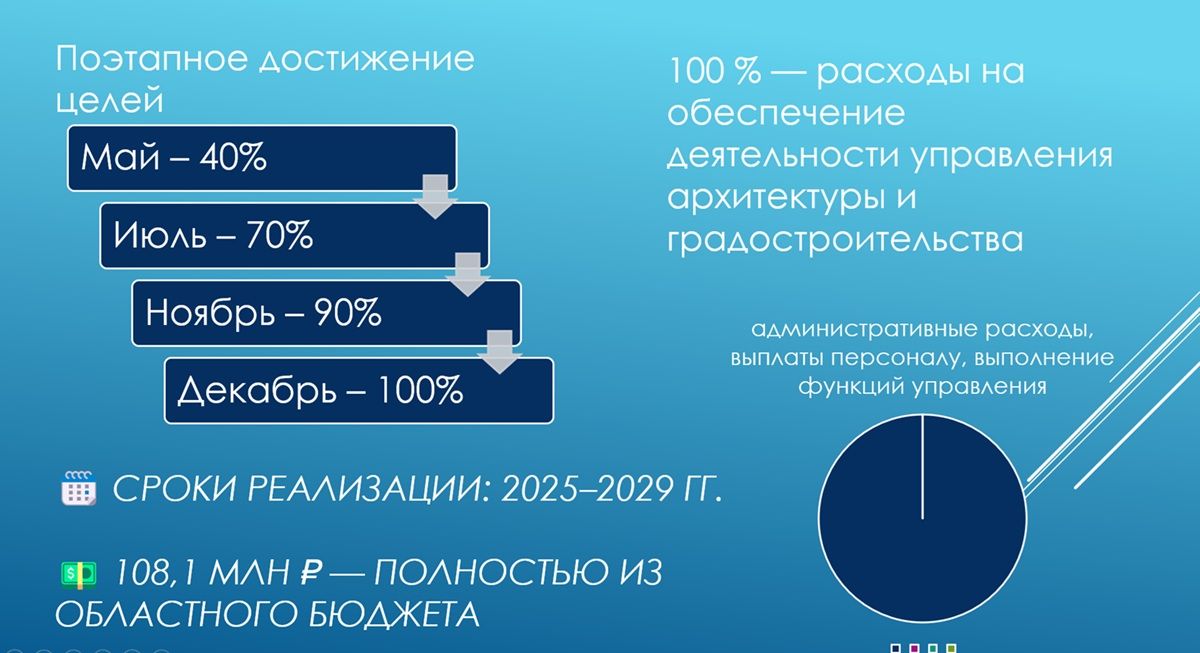 Ключевым показателем эффективности станет доля выполненных мероприятий в рамках государственной программы, которая должна сохраняться на уровне 100 % ежегодно. В 2025 году достижение показателя планируется поэтапно: 40 % — к маю, 70 % — к июлю, 90 % — к ноябрю и 100 % — к концу года.