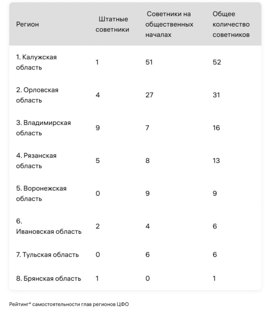 Для сравнения - у орловского губернатора Клычкова 27 советников, из которых штатных - 4. Он на втором месте в рейтинге. А замыкает список брянский губернатор Богомаз - у него всего один советник.