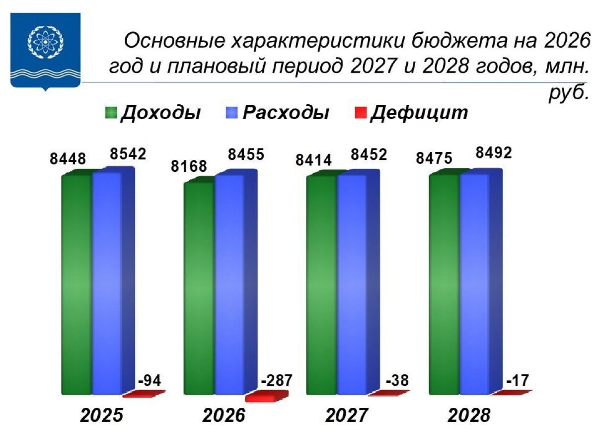 Собрание города Обнинска приняло в первом чтении бюджет города на 2026 год и на следующий двухлетний плановый период. Доходы наукограда в следующем году ожидаются в размере 8 миллиардов 168 миллионов рублей, расходы — 8 миллиардов 455 миллионов. Дефицит, таким образом, составит 287,5 миллиона рублей.