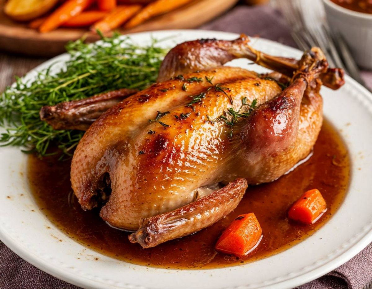 Запеченная утка или индейка с яблоками и апельсинами.