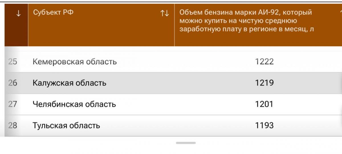 Калужская область заняла 26-е место в общероссийском рейтинге доступности бензина, рассчитанном экспертами «РИА Новости». На среднемесячную зарплату калужане могут приобрести 1219 литров бензина АИ-92 при средней цене 58,75 рубля за литр.