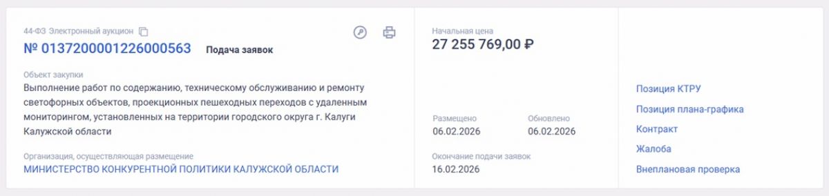 В Калуге объявлен электронный аукцион на содержание, техническое обслуживание и ремонт светофорных объектов и проекционных пешеходных переходов с удалённым мониторингом. Начальная цена контракта составляет 27,25 млн рублей. Соответствующая информация размещена на сайте госзакупок.