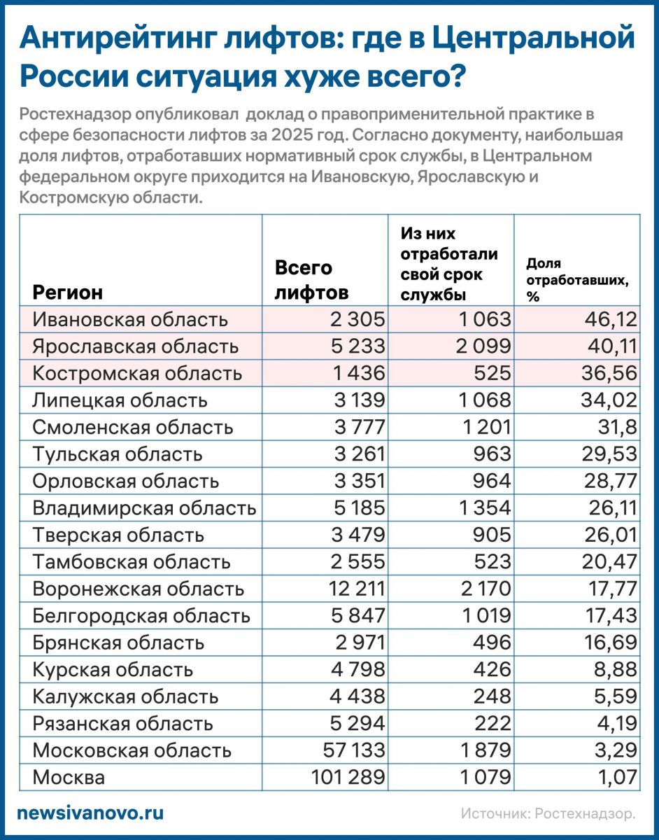 Худшая ситуация сложилась в Ивановской области, которая заняла первое место с показателем износа 46,12%. Наилучшие результаты — в Москве, где доля таких лифтов составляет всего 1,07%.