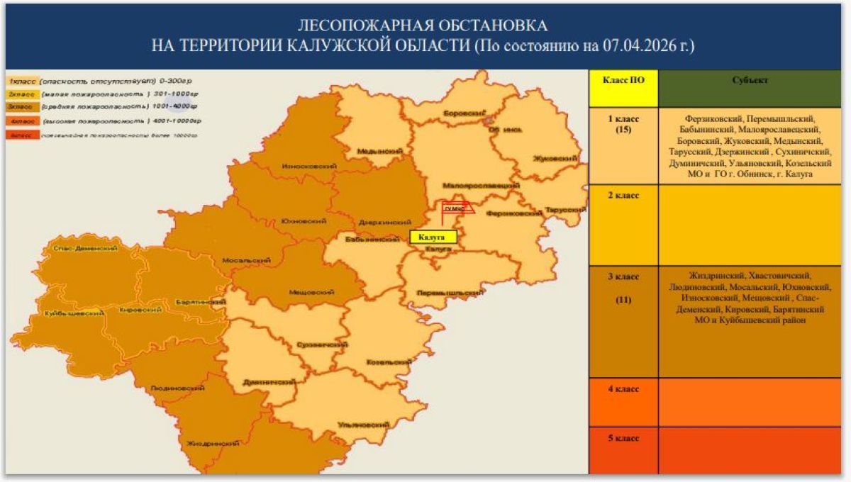При этом пока что в 13 муниципальных округах области (Ферзиковском, Перемышльском, Бабынинском, Малоярославецком, Боровском, Жуковском, Медынском, Тарусском, Дзержинском, Сухиничском, Думиничском, Ульяновском, Козельском), а также в Обнинске и Калуге опасность лесных пожаров на нуле.