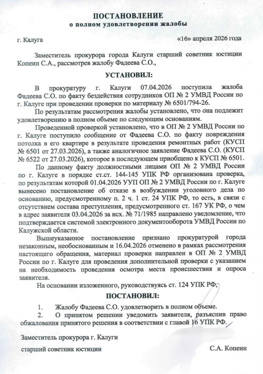 Известный калужский блогер и журналист Сергей Фадеев на своей странице Вконтакте рассказал, что управляющая компания в ходе работ на чердаке проделала трещину в потолке кухни его родителей. Несмотря на попытки заставить залатать пролом, УК не реагировала. Безрезультатным оказалось и обращение в Госжилинспекцию, и в полицию. Единственный успех ждал калужанина в прокуратуре - там отменили решение участкового об отказе в возбуждении уголовного дела за отсутствием состава преступления.