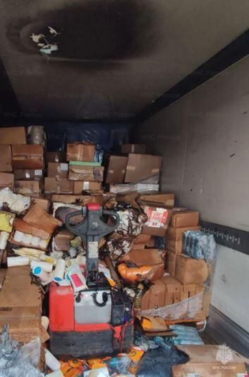 Вспыхнул самоходный штабелер - судя по опубликованным пресс-службой областного ГУ МЧС фотографиям с места происшествия, это произошло при погрузочно-разгрузочных работах, вероятно - прямо внутри фуры.
