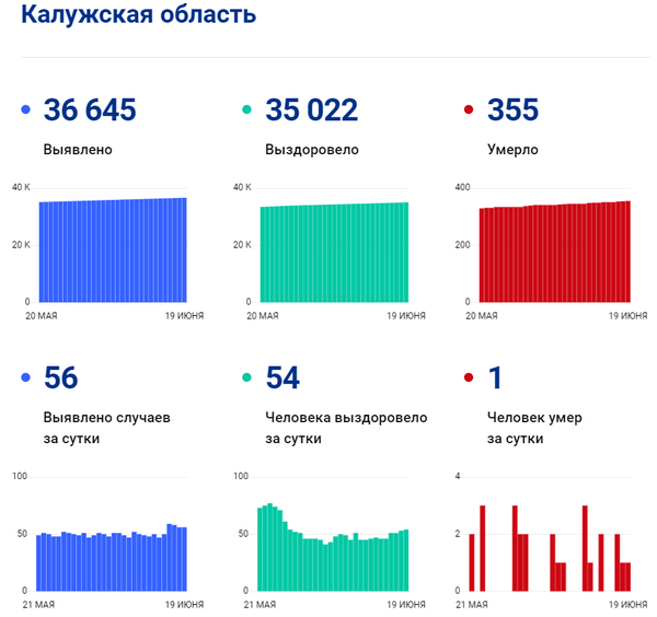 19 июня федеральный оперштаб сообщил новые данные по коронавирусу в Калужской области.