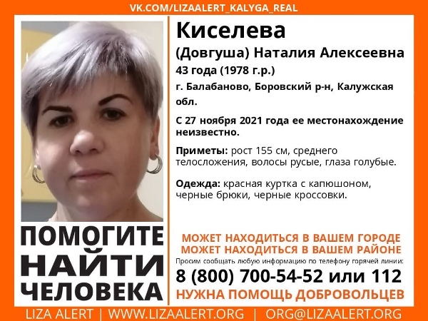 Региональное отделение добровольческого поискового отряда "ЛизаАлерт" объявило в своей группе Вконтакте о начале поисков 43-летней Наталии Киселевой (Довгуши) из Балабаново. О ее местонахождении ничего не известно с 27 ноября.