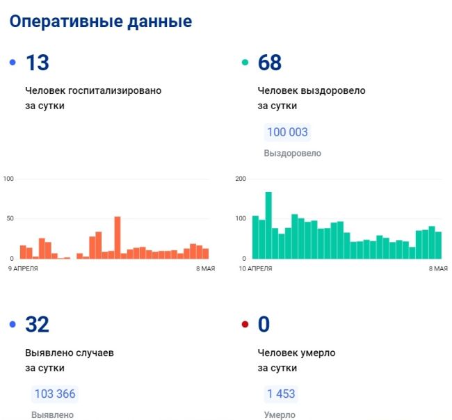 Согласно представленным данным, за последние сутки еще 32 человека заразились коронавирусом, 13 из них пришлось госпитализировать. Общее количество заразившихся - 103 366.